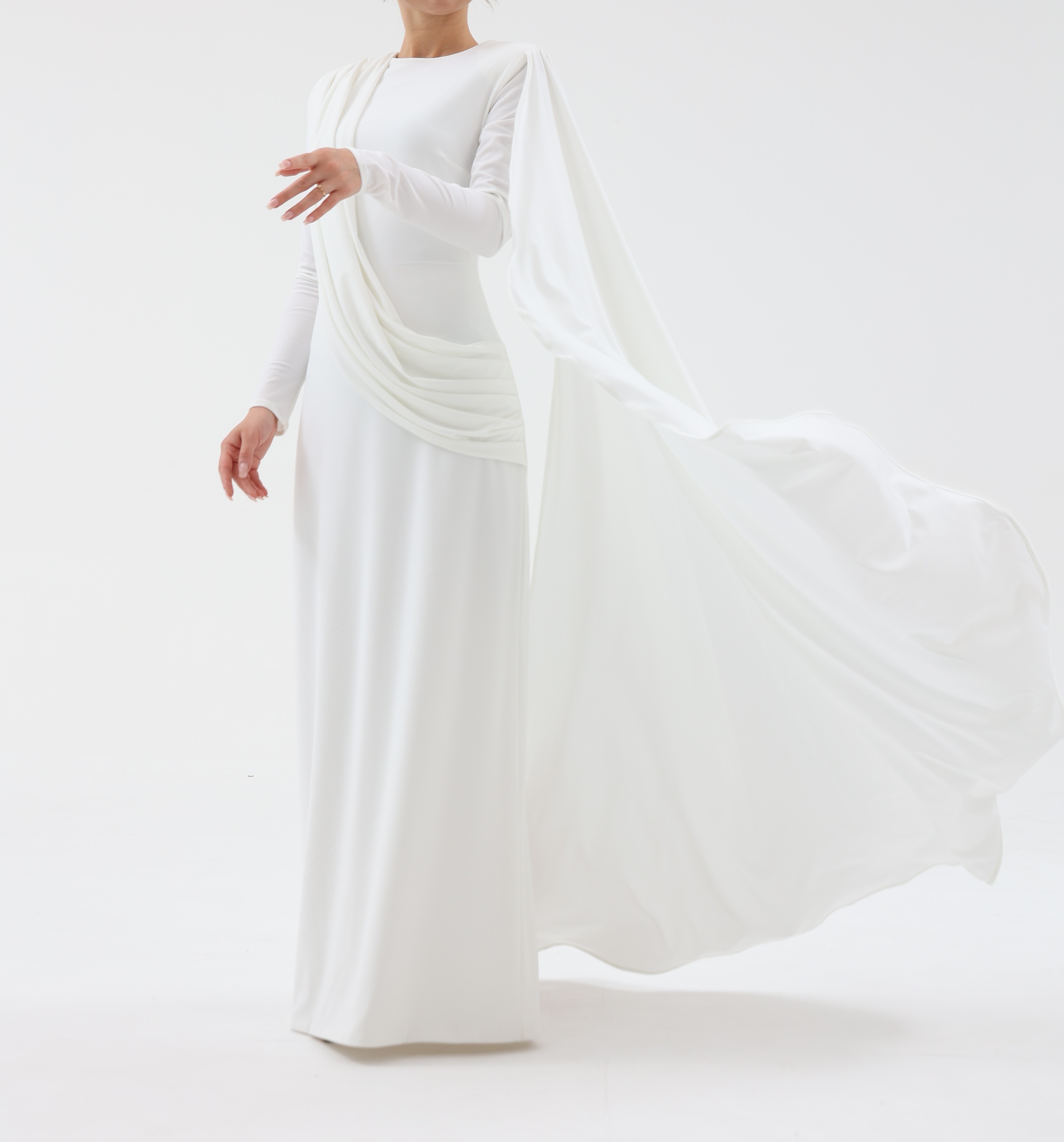 إطلالة راقية وجذابة مع الفستان الأبيض الطويل المصنوع من قماش الاسترتش المريح، الذي ينساب بانسيابية مثالية على القوام ليبرز جمال الجسم برقة